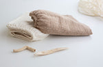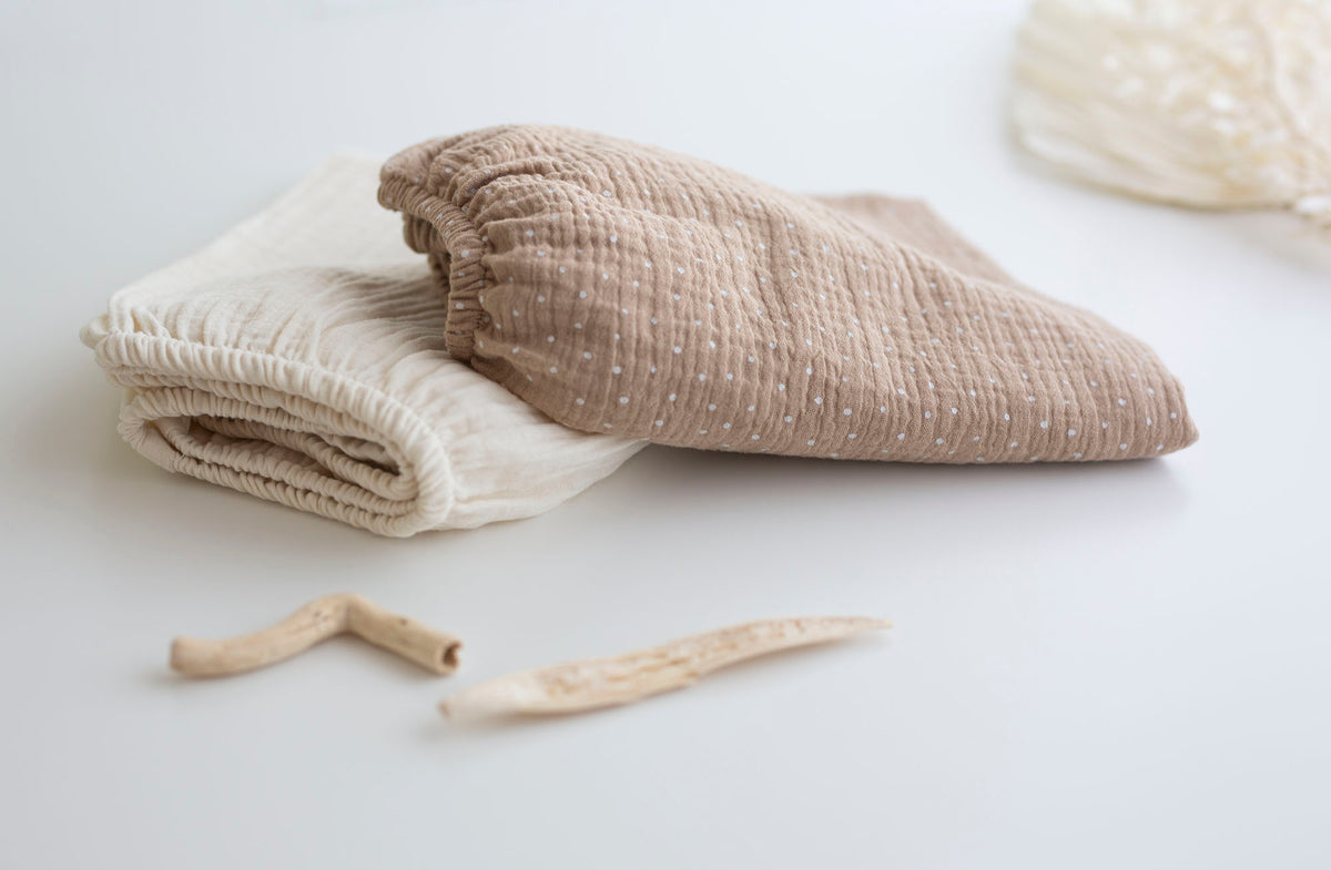 Muslino paklodė su guma "Šviesiai ruda su baltais taškiukais. Vanilinė"