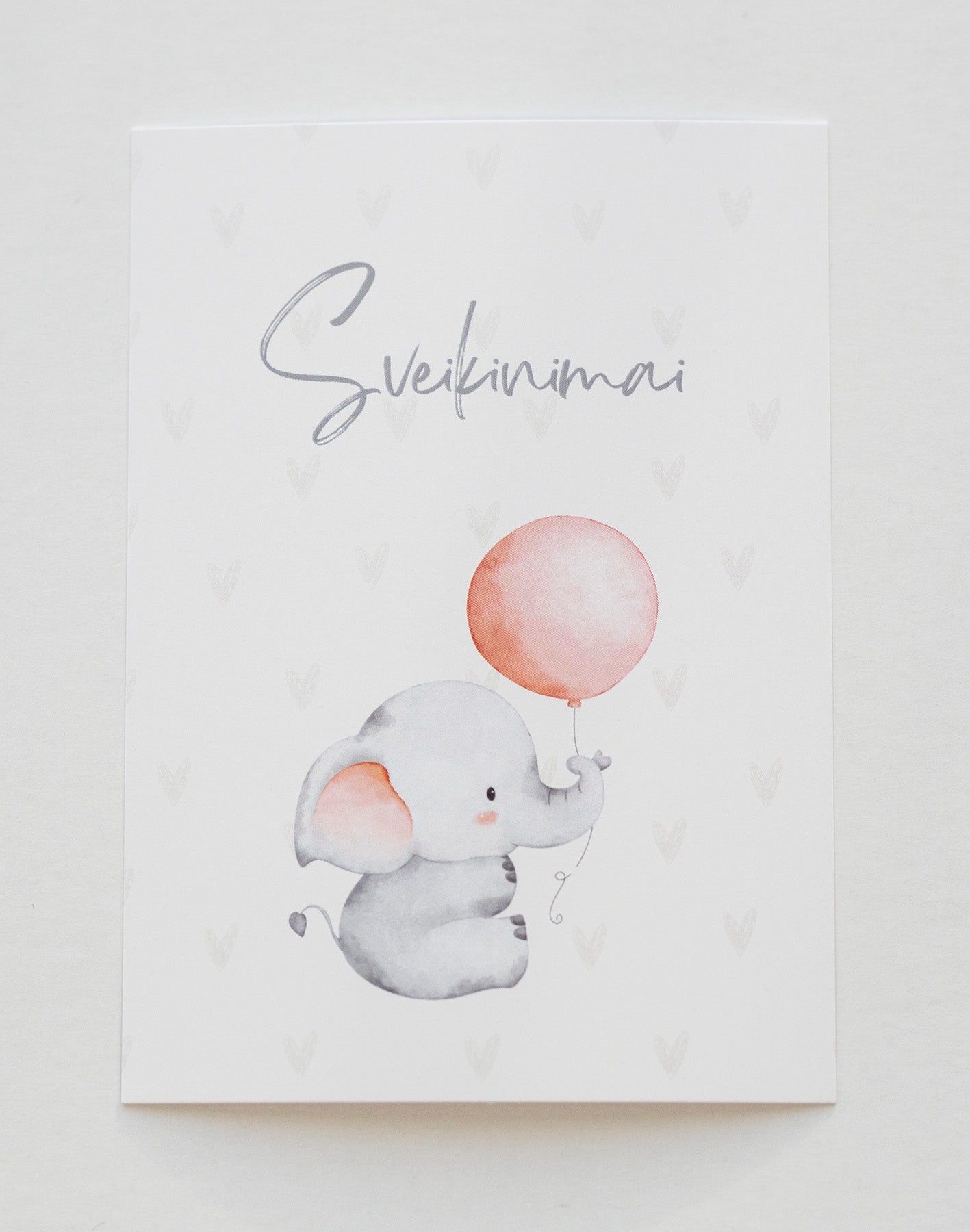 Minimalistinis ir jaukus dizainas su drambliuku rankoje laikančiu balioną. Ši atvirutė – universalus pasirinkimas nuoširdžiam palinkėjimui bet kokia proga: gimtadieniui ar krikštynoms.