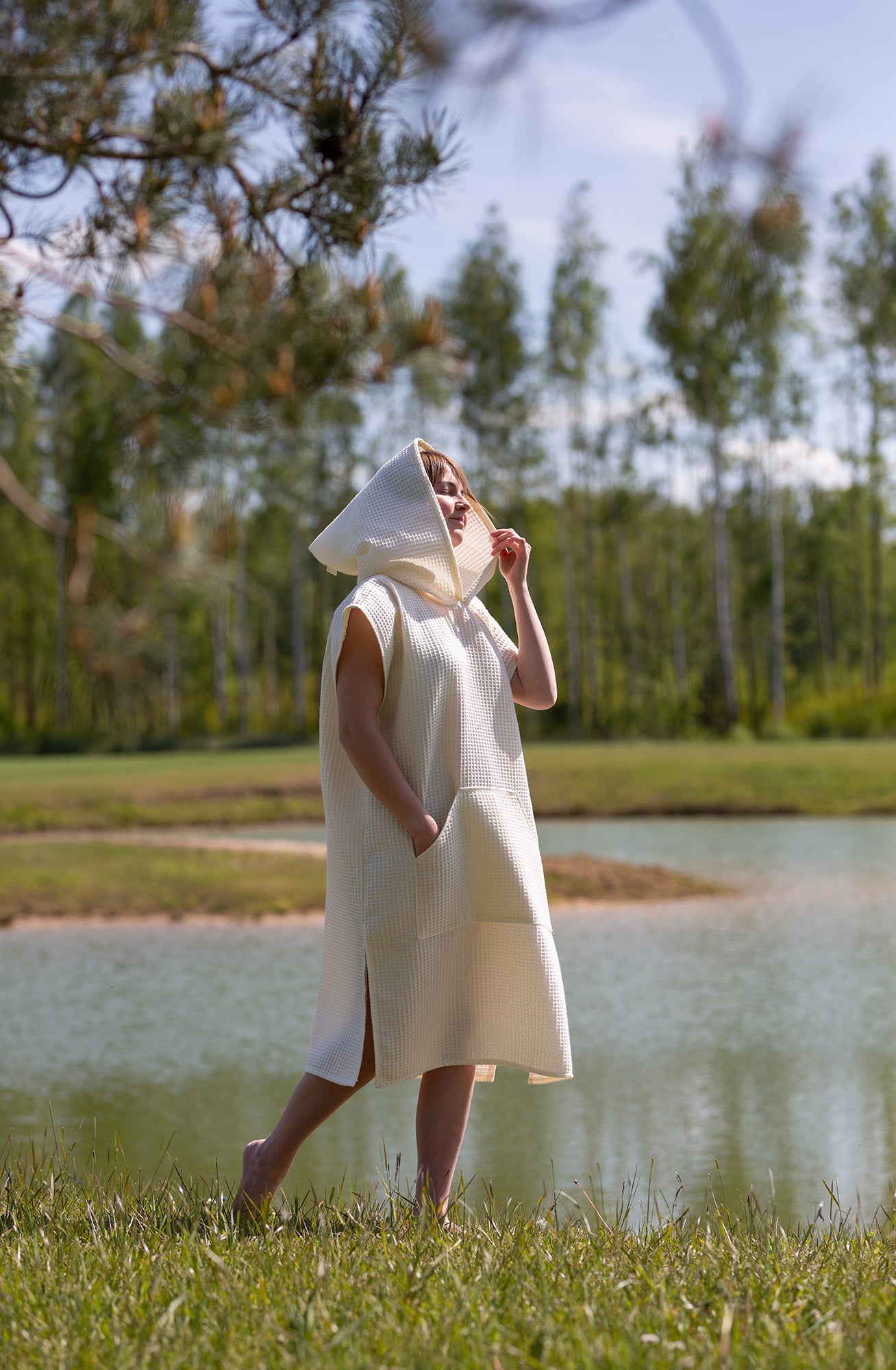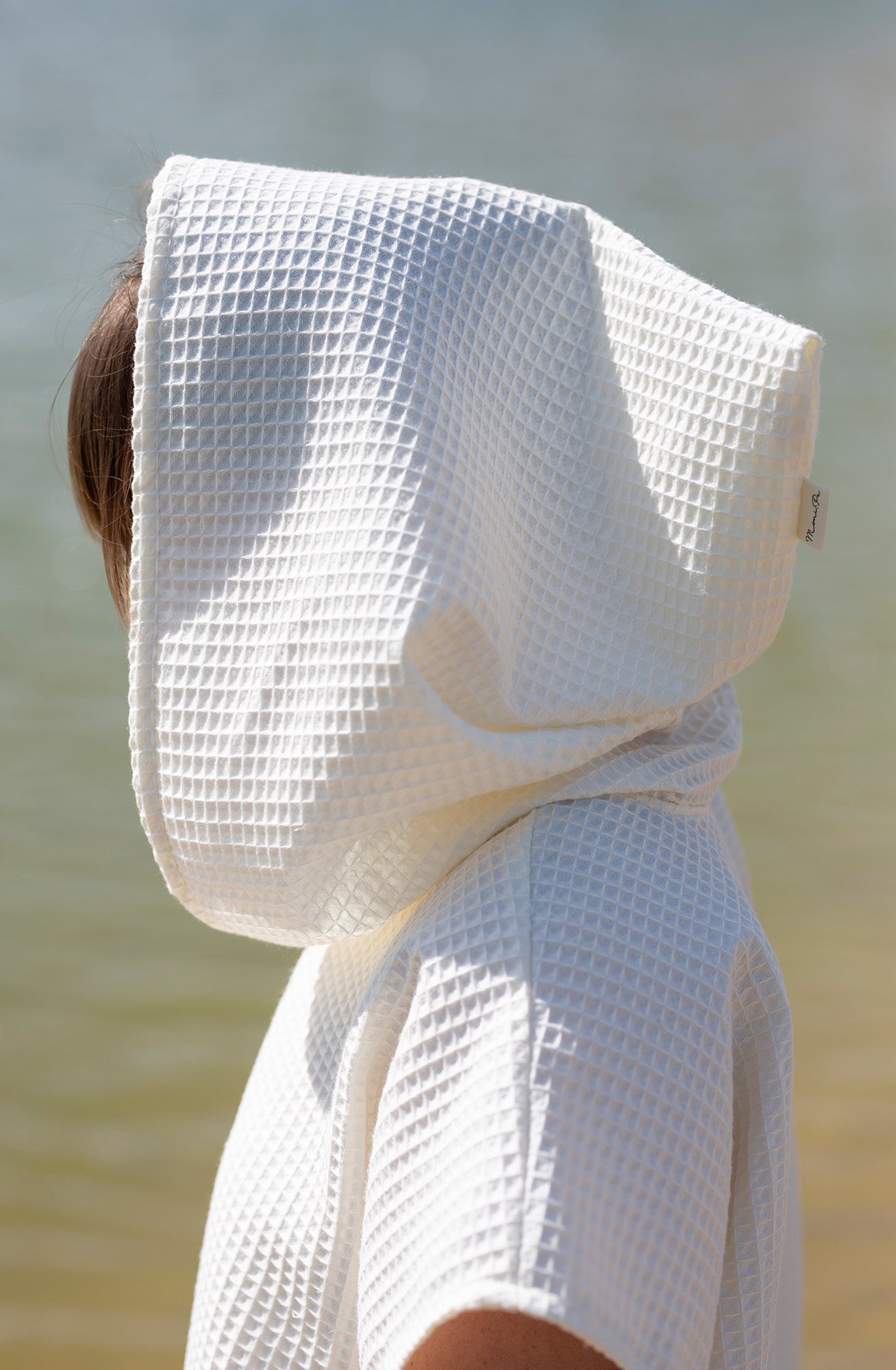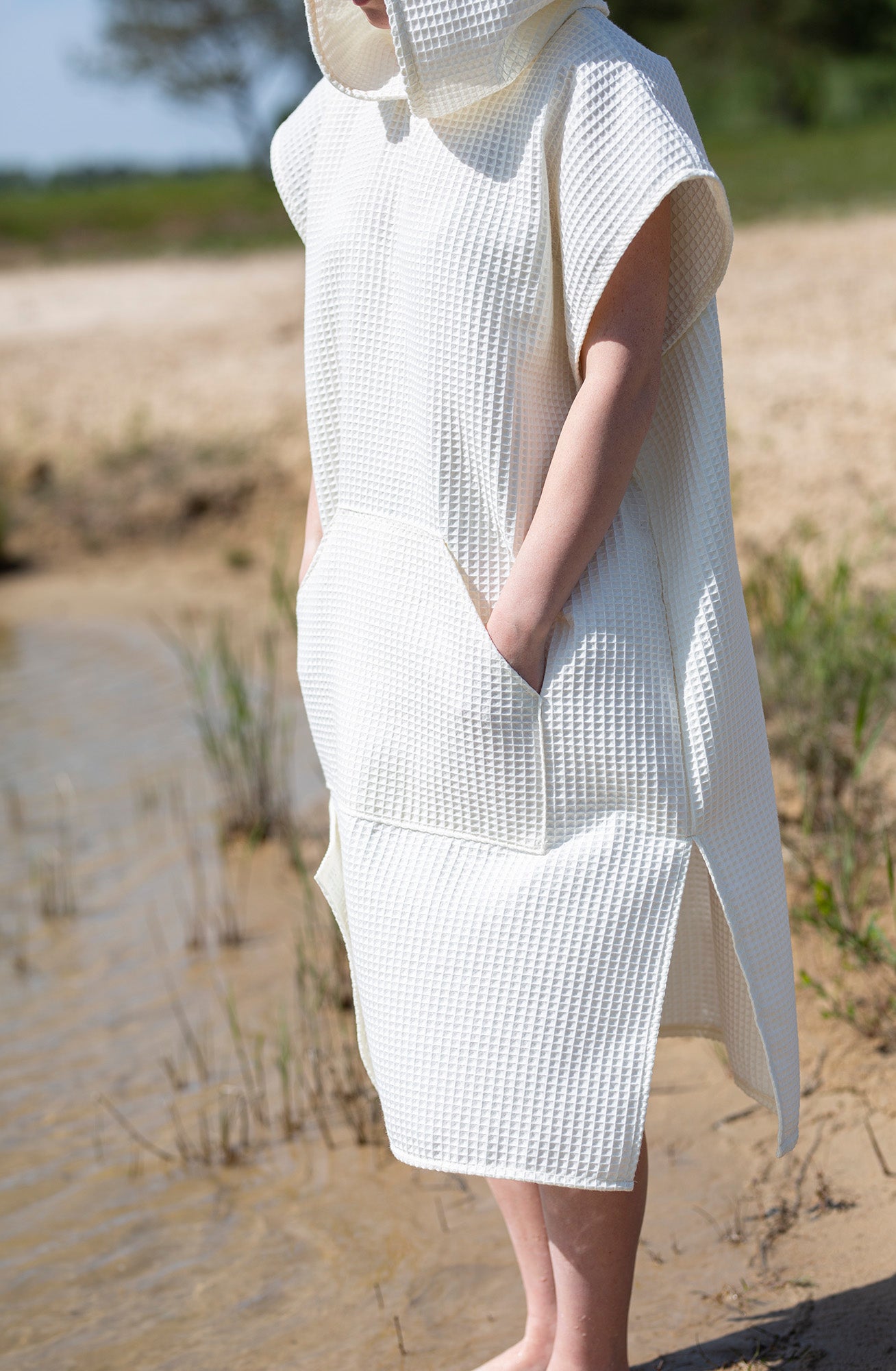 The waffle fabric poncho with a hood – is a comfortable, natural, and unrestrictive choice for both the beach, the pool, and cozy relaxation at home or in a cottage. Made from 100% cotton waffle fabric, this poncho is soft, absorbs moisture well, and dries quickly. It gently wraps around the body, allows the skin to breathe, and protects against the sun or wind. The hood provides extra coziness – protects against wind and cold, while the loose cut allows for complete comfort. In the front – a spacious pocket for small items or hands. Sizes: - S/M – width 110cm; length 135cm - L/XXXL – width 120cm; length 150cm Children's ponchos here.