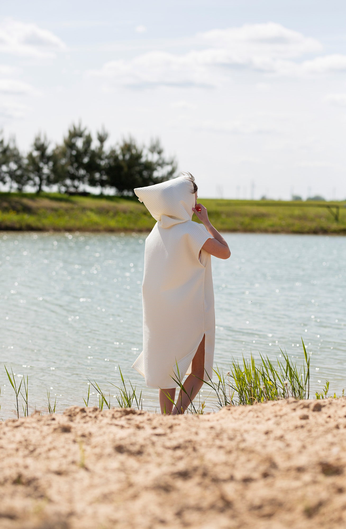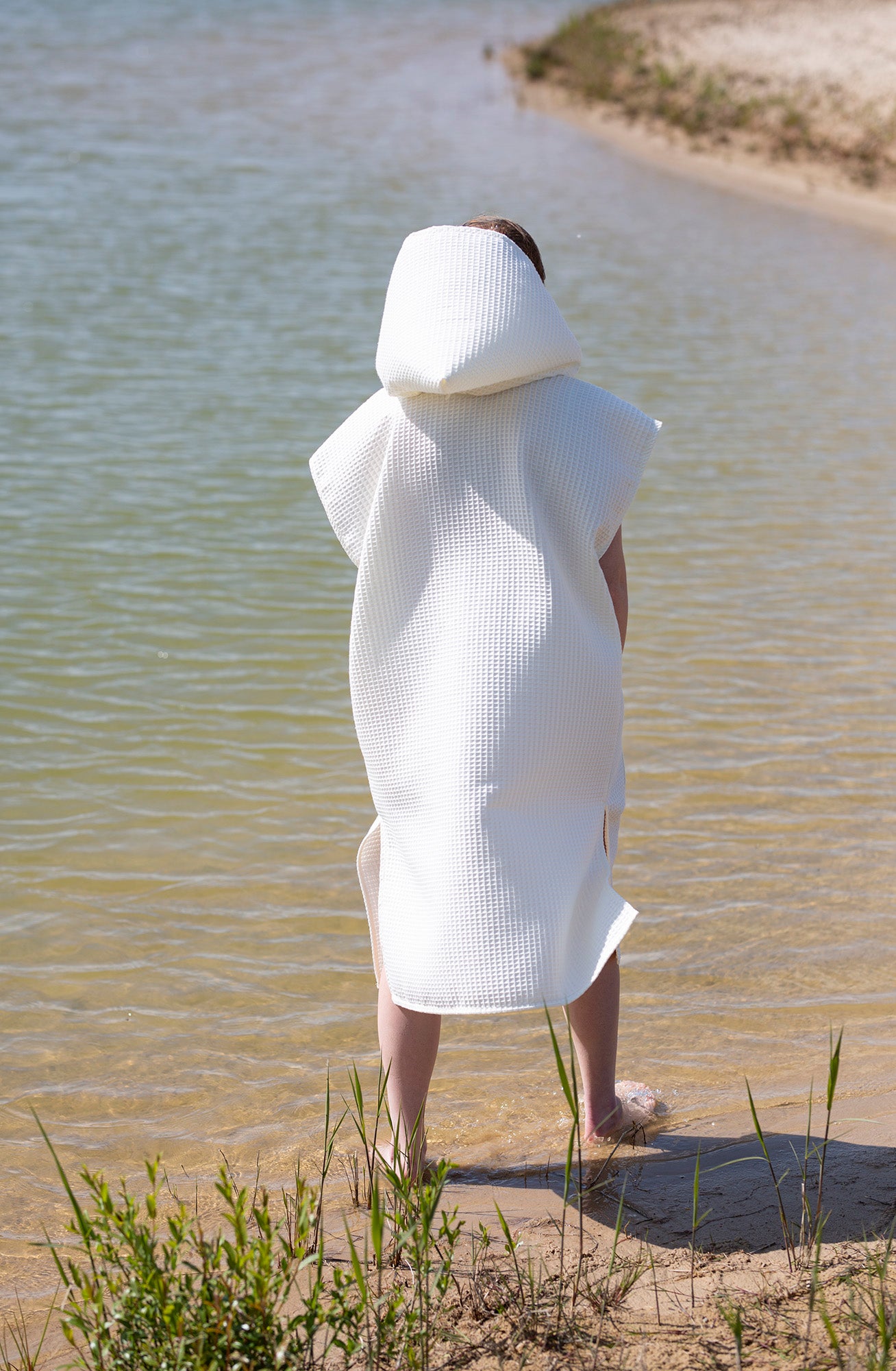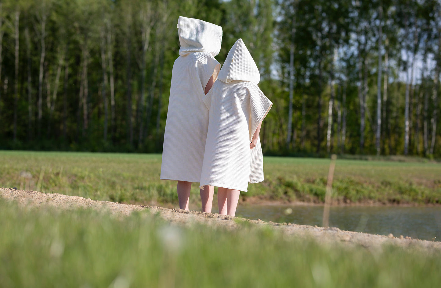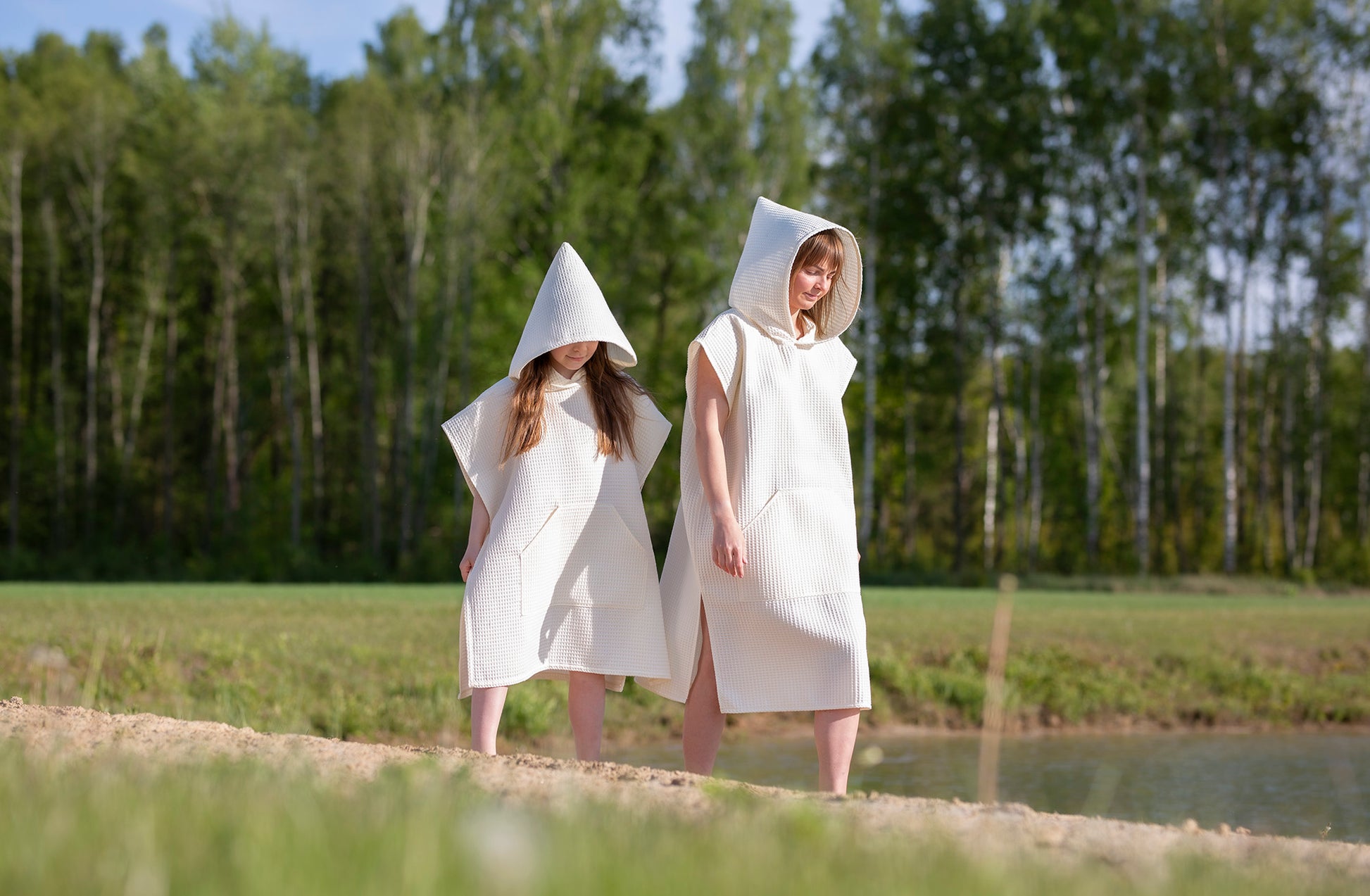 The waffle fabric poncho with a hood – is a comfortable, natural, and unrestrictive choice for both the beach, the pool, and cozy relaxation at home or in a cottage. Made from 100% cotton waffle fabric, this poncho is soft, absorbs moisture well, and dries quickly. It gently wraps around the body, allows the skin to breathe, and protects against the sun or wind. The hood provides extra coziness – protects against wind and cold, while the loose cut allows for complete comfort. In the front – a spacious pocket for small items or hands. Sizes: - S/M – width 110cm; length 135cm - L/XXXL – width 120cm; length 150cm Children's ponchos here.