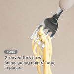 Specialiai mažo vaiko rankai sukurto ergonomiško kotelio dėka šakutę ir šaukštą lengva suimti ir laikyti įvairiose pozicijose.