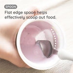 Kampuotos formos ir plokščio dizaino šaukštu lengvai pasieksite net ir sunkiai prieinamus indelių kampelius.