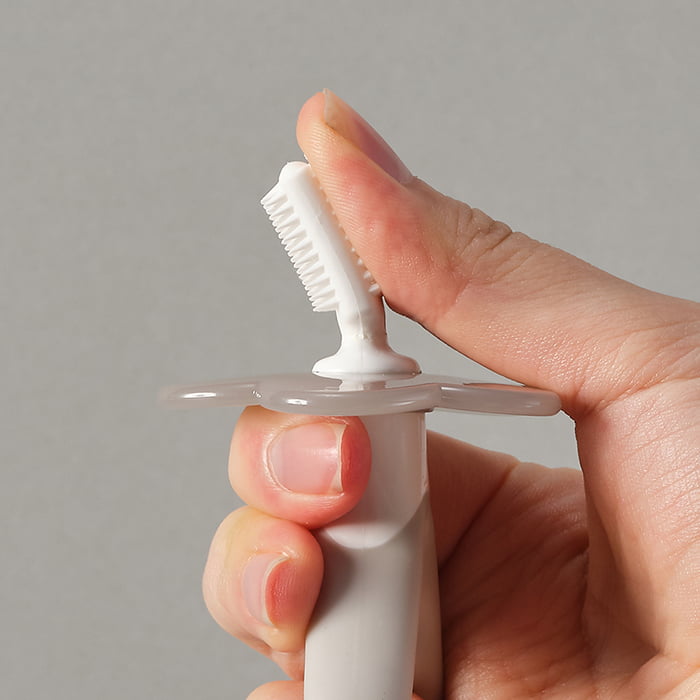 Kai dygsta kūdikiui dantys, pradėkite valyti su šiuo amortizuojančiu šepetėliu.