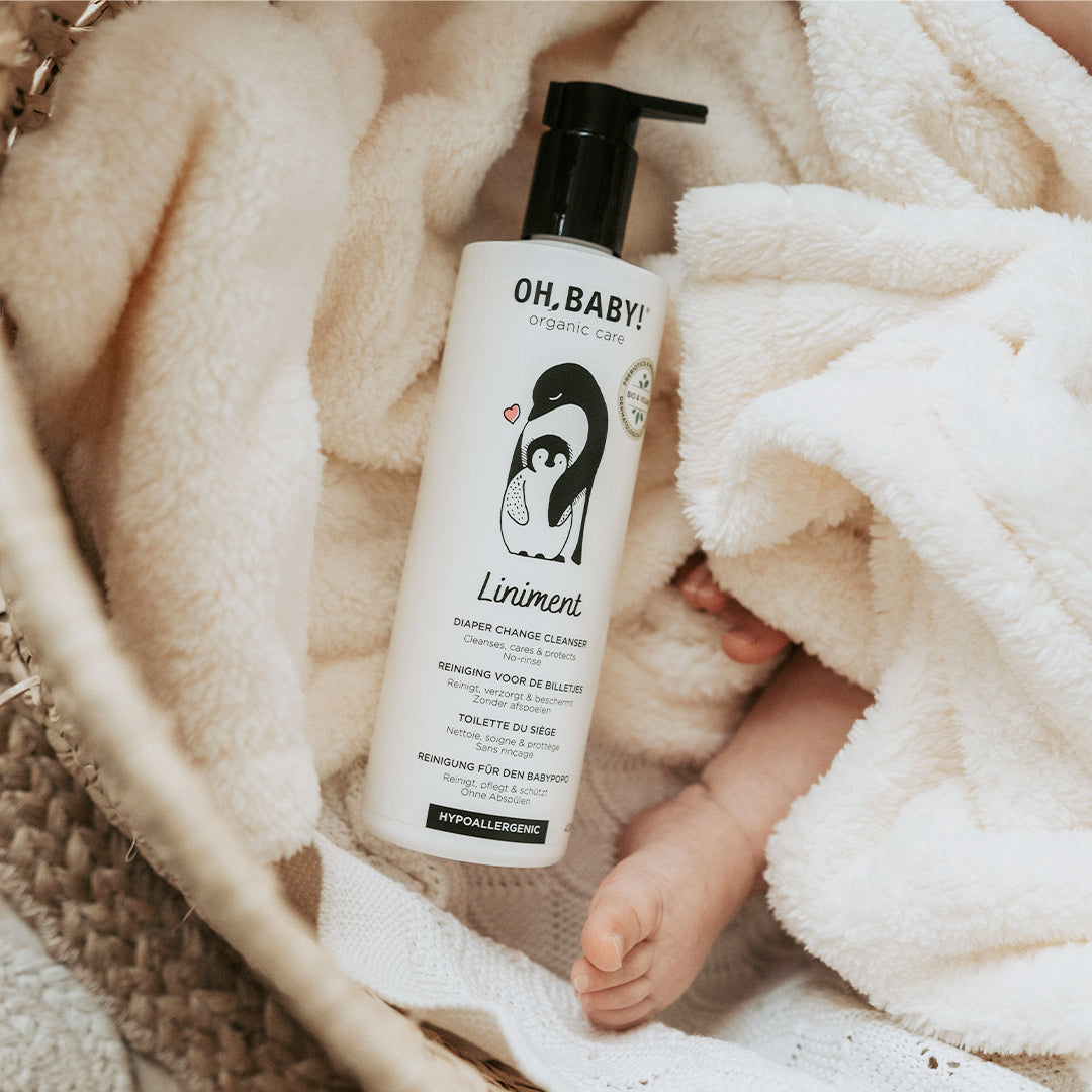 “Oh, Baby!” Linimentas yra 2in1 – jis yra puikus sauskelnių keitimo valiklis. Jis nuvalo ir apsaugo jūsų kūdikio užpakaliuką. Linimente yra kalkių vandens – kad sunaikintų bakterijas, ir aliejaus – kad apsaugotų jautrią odelę. Linimentas pagamintas migdolų aliejaus pagrindu – jis reguliuoja drėgmę, ramina sudirgimus ir paraudimą, yra prisotintas mineralų ir vitaminų. Todėl jis stiprina odos hidrolipidinį sluoksnį. Taigi, jums nebereikia drėgnų servetėlių ar kremo nuo iššutimų. Ir galite atsisveikinti su sauskelnių bėrimu!