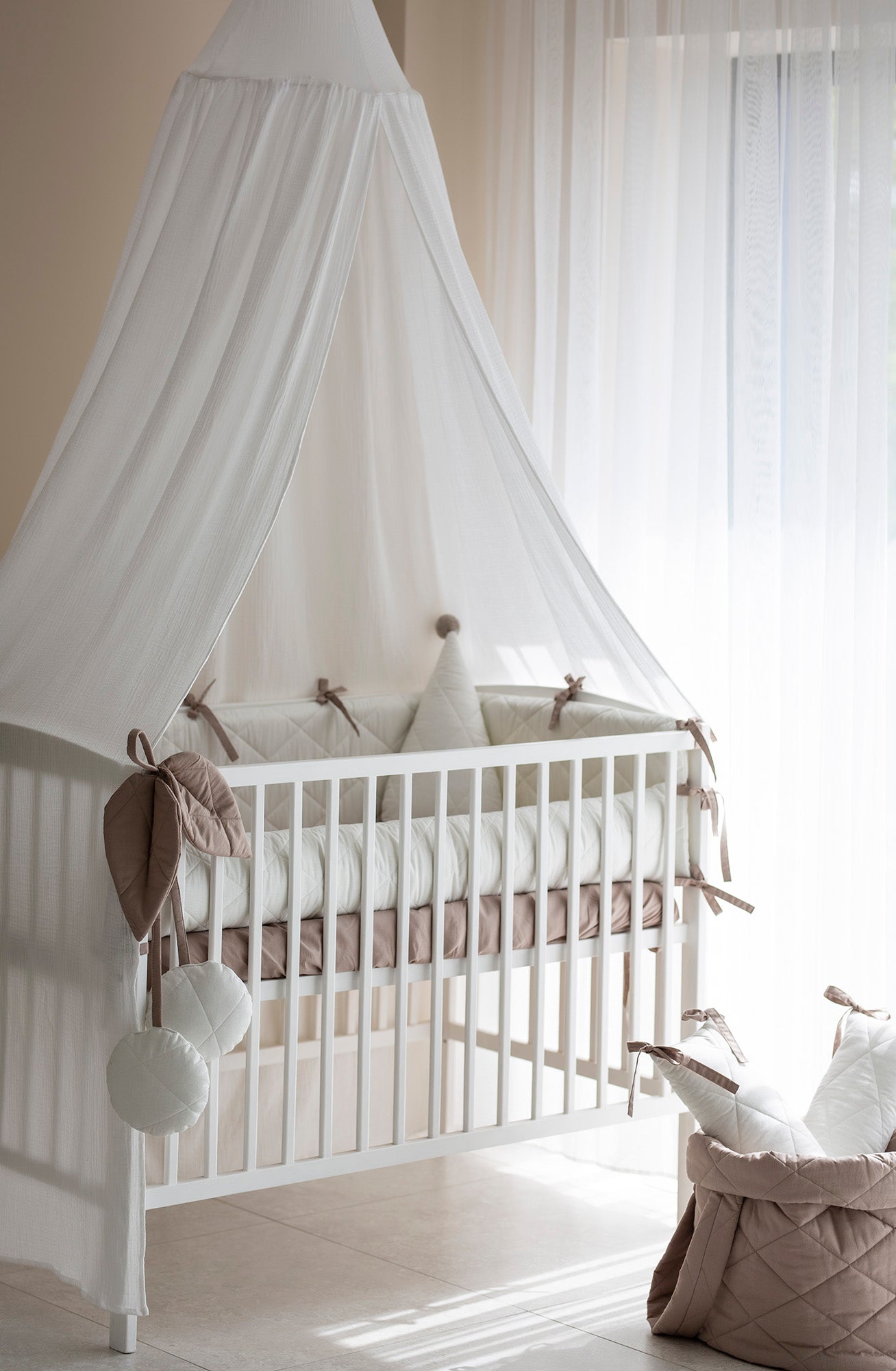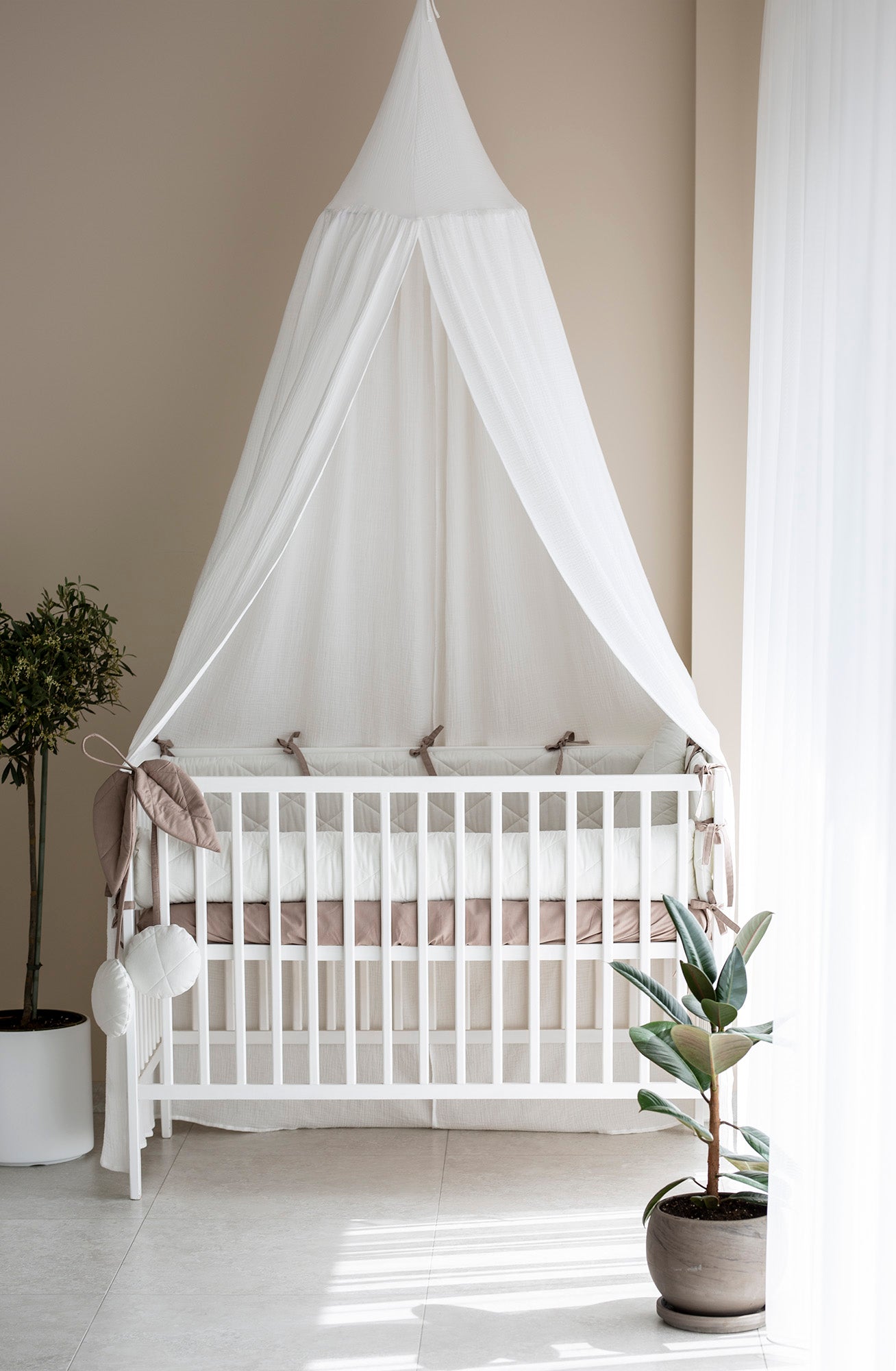 Šis baldakimas, pagamintas iš muslino audinio, bet kurį kambarį paverčia magiška oaze, sukurdamas jaukią ir ramią atmosferą. Minkštas, orui pralaidus audinys apgaubia lovytę ir sukuria svajingą įvaizdį, pridėdamas žavesio bet kokiam interjerui.🍃🤍
