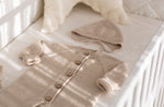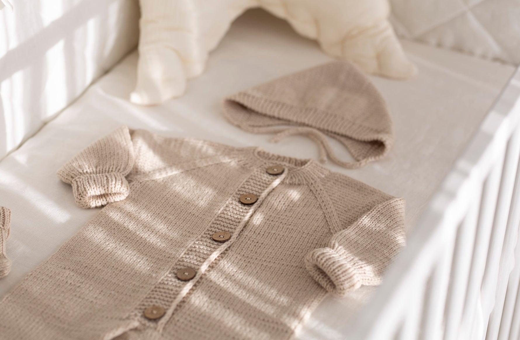 Papildomai derinamos tokios pat spalvos mezgtos kojinytės ir kepurytė – puikus komplektukas pirmosioms fotosesijoms, pasivaikščiojimams ar jaukioms dienoms namuose.
